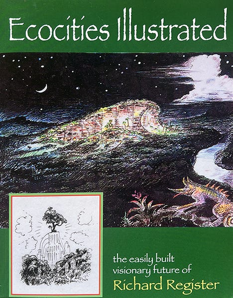 Attached are images from Richard Register’s book, Ecocities Illustrated.
